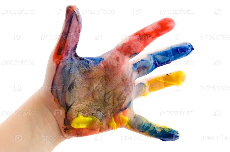 Детская ладошка в краске. Изолированная на белом фоне