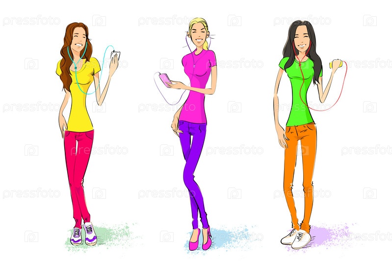 Три девушки слушать музыкальный плеер с наушниками на белом фоне