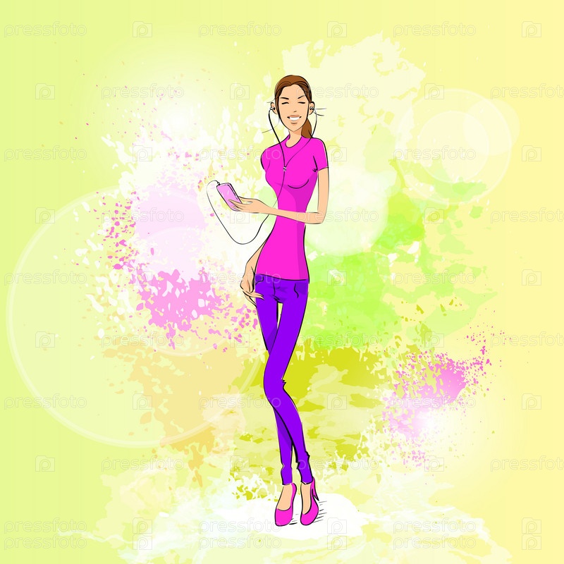 Женщина прослушивание музыки держать игрока случайные на фоне краски красочные заставки