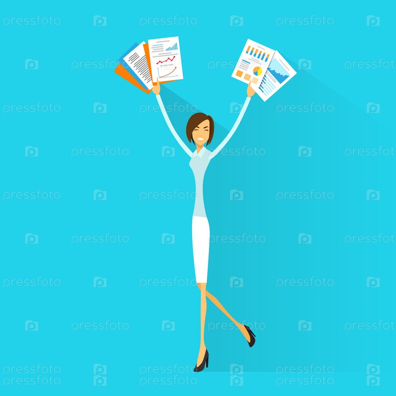 Бизнес женщина рады держать руки вверх подняли оружие бумажных документов