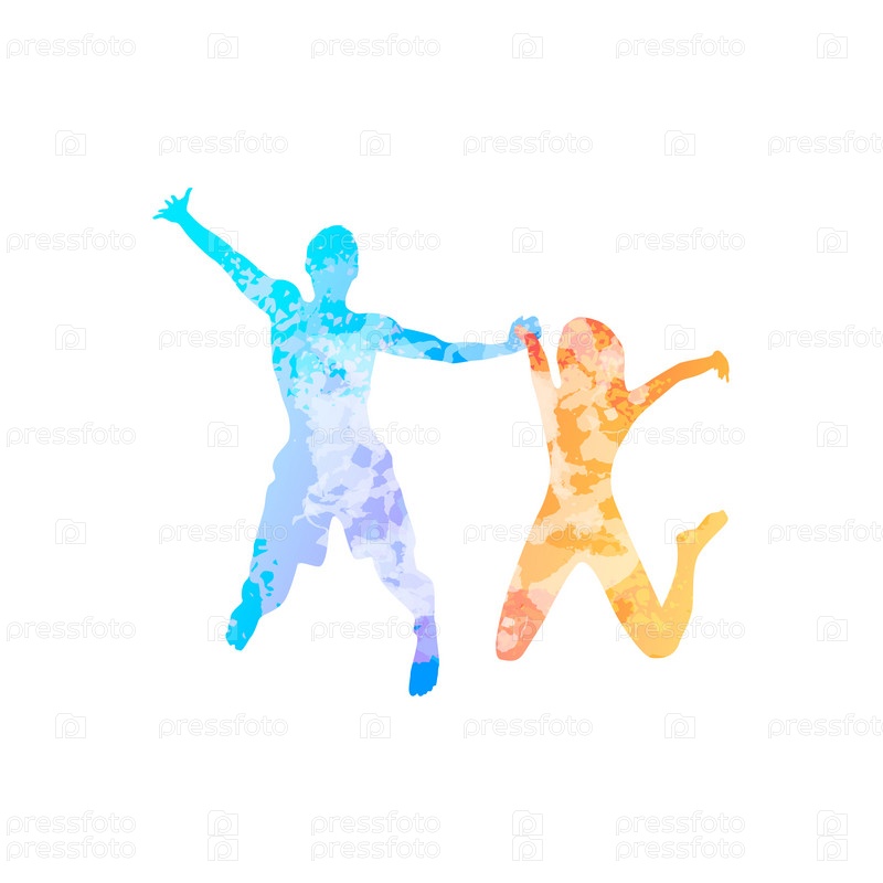 Пара человек и женщина, держа руки прыгать красочный силуэт