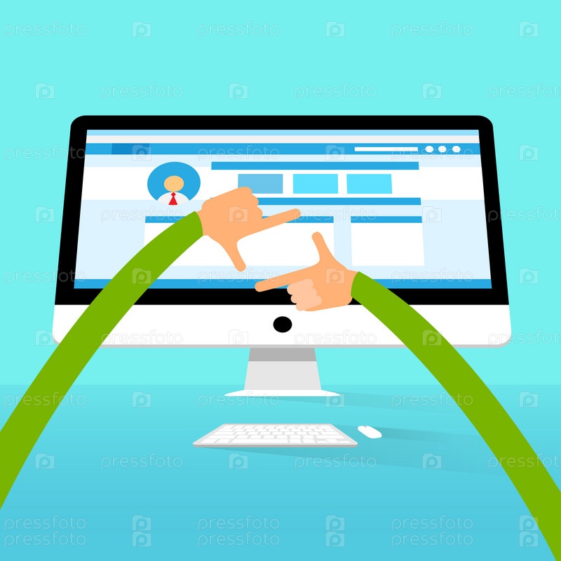 Отображение настольного компьютера монитор рабочей области, руки над большой экран