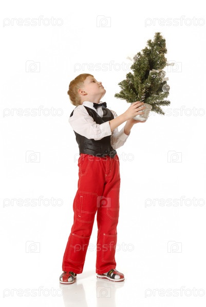 Маленький мальчик держит в руках маленькую елочку