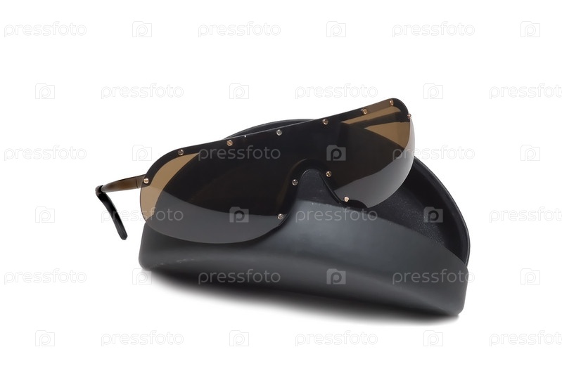 Солнцезащитные очки в черном футляре. Изолированные на белом фоне