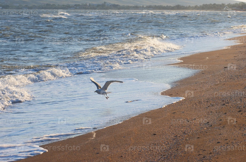 Чайка летит над песчаным пляжем ранним утром