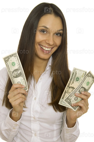Привлекательная бизнес-леди с долларами в руках, на белом фоне