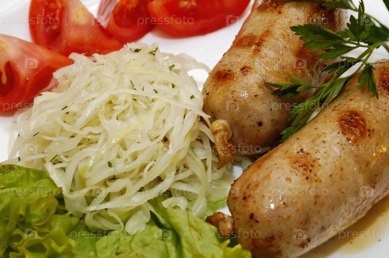 Жареные колбаски со свежими овощами крупным планом