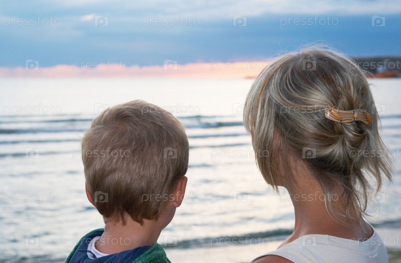 Мать с маленьким мальчиком на вечернем побережье