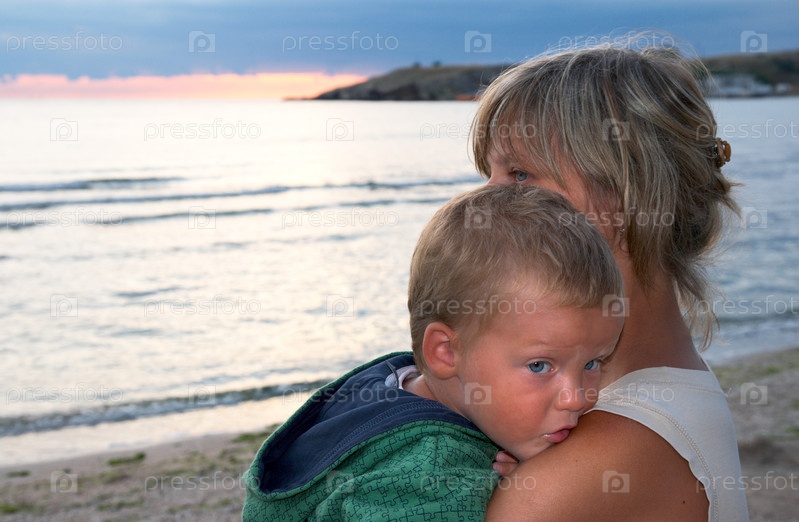 Мать с маленьким мальчиком на вечернем побережье