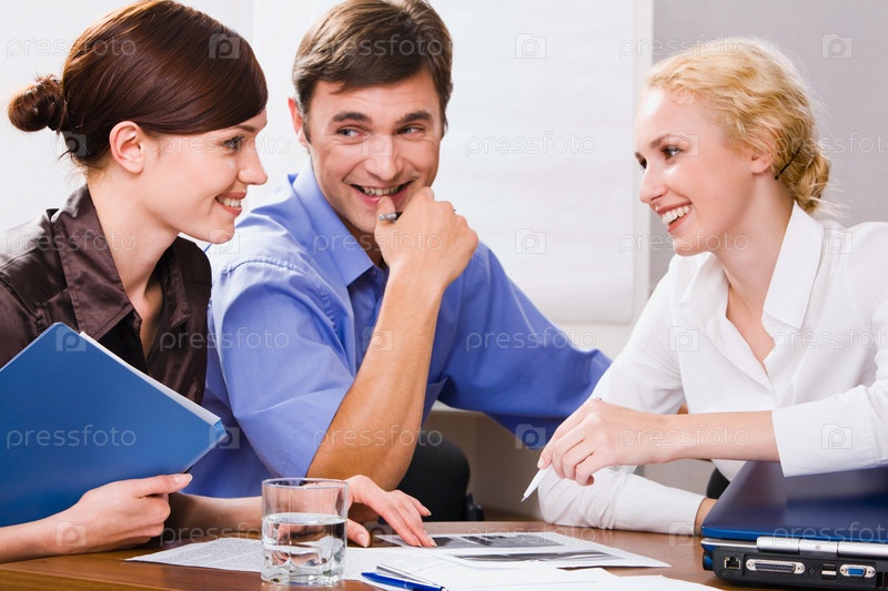 Портрет трех успешных профессионалов, улыбающихся в рабочей среде