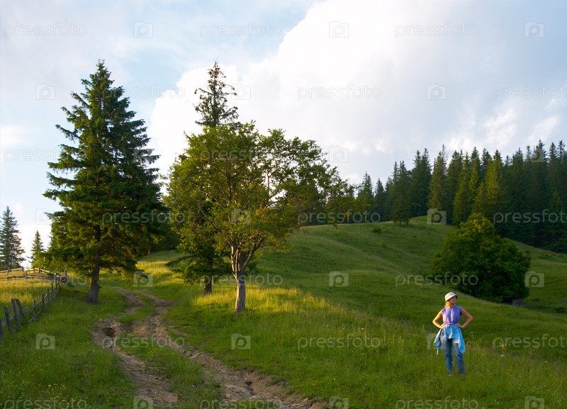Женщина возле сельской дороги в горах (Карпатский, Украина)