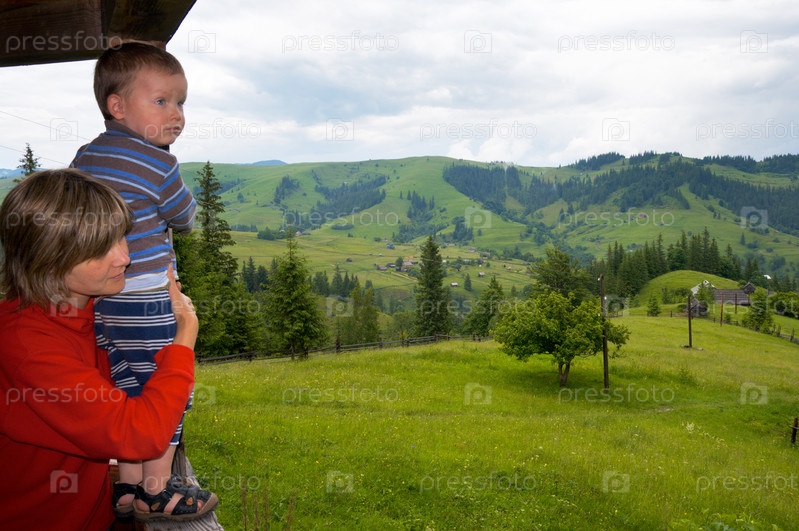 Мать с маленьким мальчиком смотрят на горы