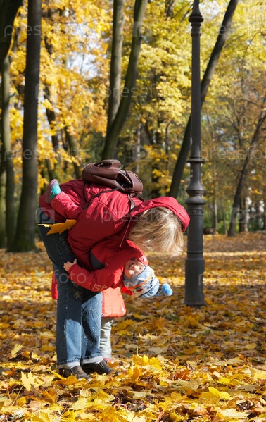 Счастливая семья (мать с маленькими детьми) в золотом осеннем городском парке