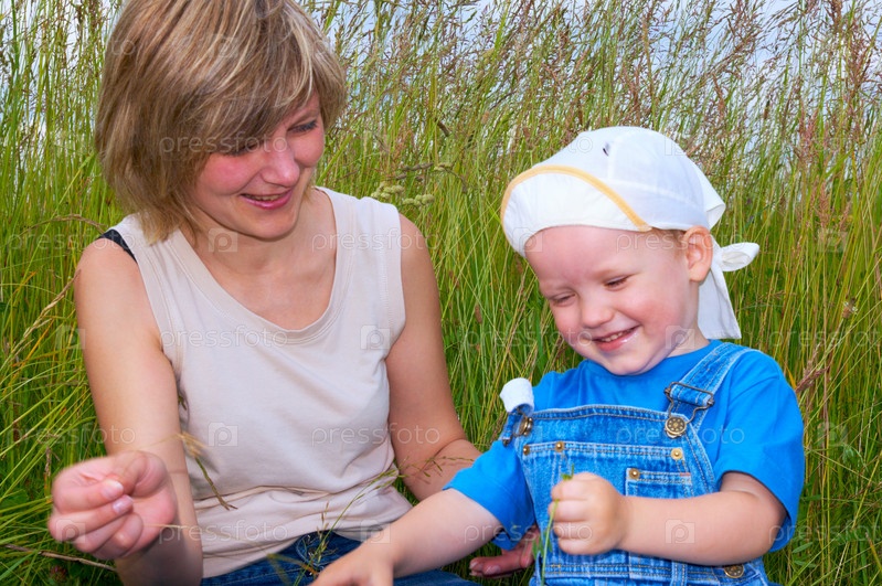 Мать с маленьким мальчиком играет на лугу в высокой траве