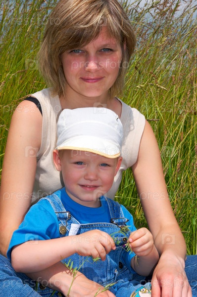 Мать с маленьким мальчиком на лугу в высокой траве