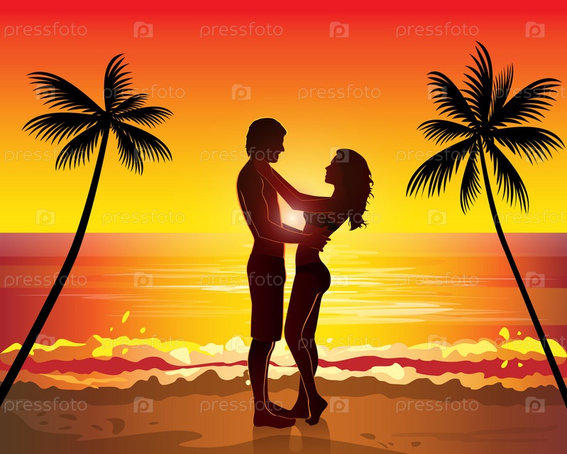 Романтическая пара на пляже на закате
