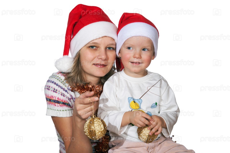 Счастливая мать с маленьким сыном перед рождеством, на белом фоне