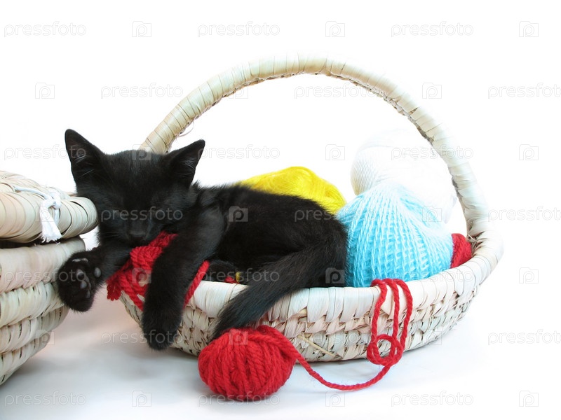 Спящий котенок в корзине с пряжей