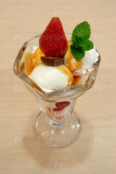 Мороженое с карамелью и клубникой