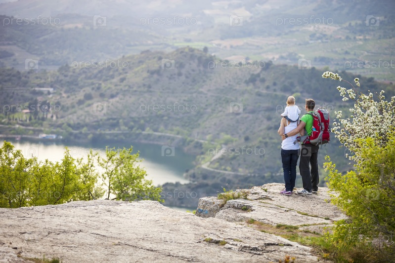 Молодая пара с малышом на скале