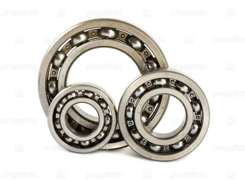 Три стальных шарикоподшипника на белом фоне