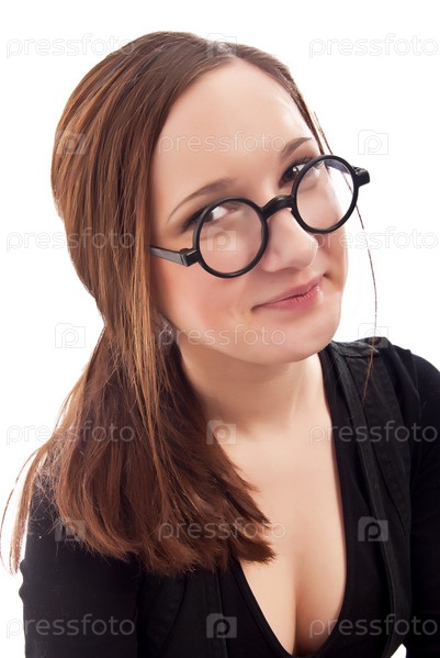 Улыбающаяся молодая девушка в очках на белом фоне
