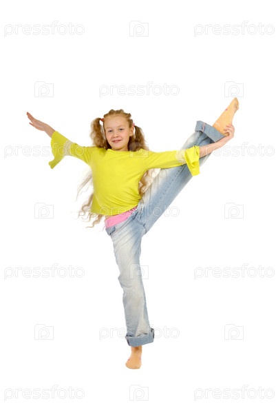 Девочка занимается аэробикой на белом фоне