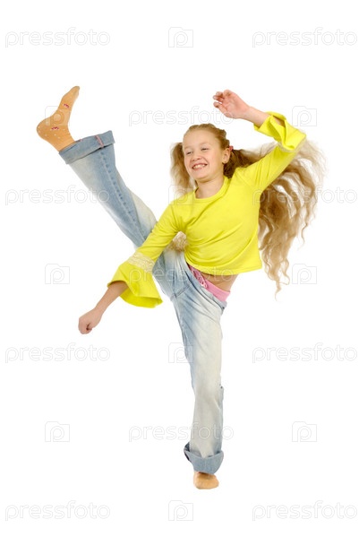 Девочка занимается аэробикой на белом фоне