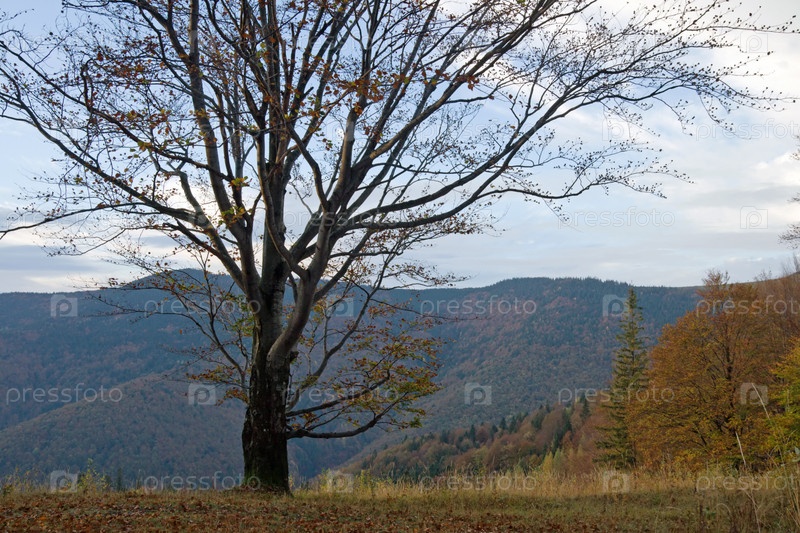 Большое голое дерево на фоне осенних гор