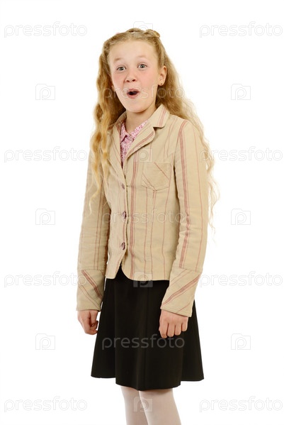 Портрет эмоциональной девочки-школьницы с длинными волосами на белом фоне