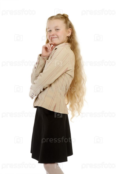 Портрет девочки-школьницы с длинными волосами на белом фоне