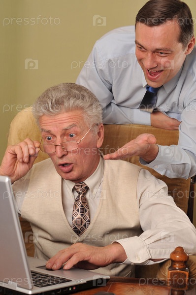 Эмоциональные пожилой и взрослый мужчины работают за ноутбуком