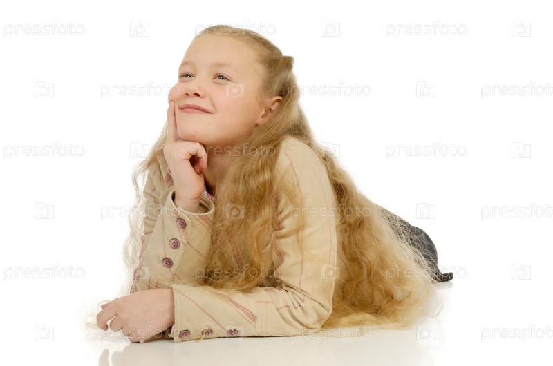 Портрет девочки-школьницы с длинными волосами, лежащей на полу на белом фоне