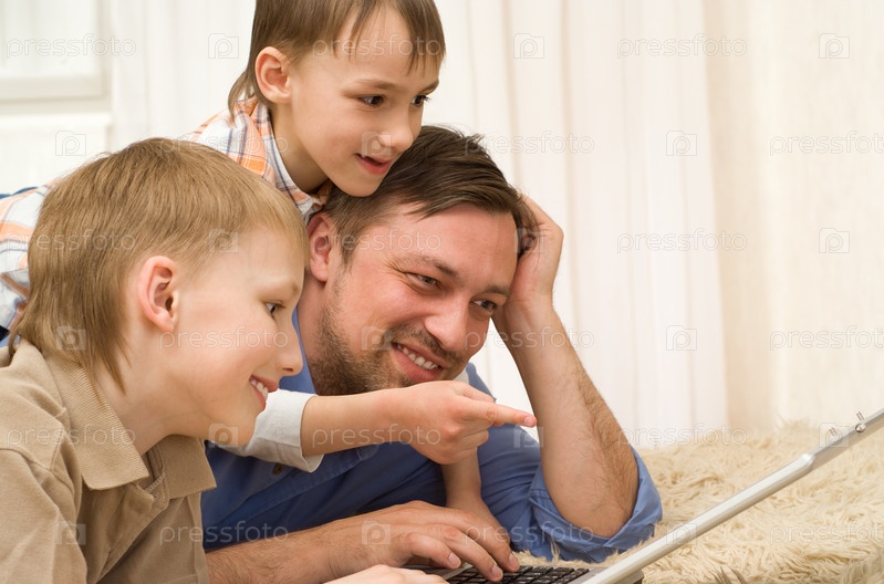 Счастливый отец и двое сыновей лежат на ковре с ноутбуком