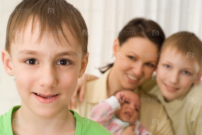 Улыбающийся мальчик с матерью, братом и маленькой сестренкой
