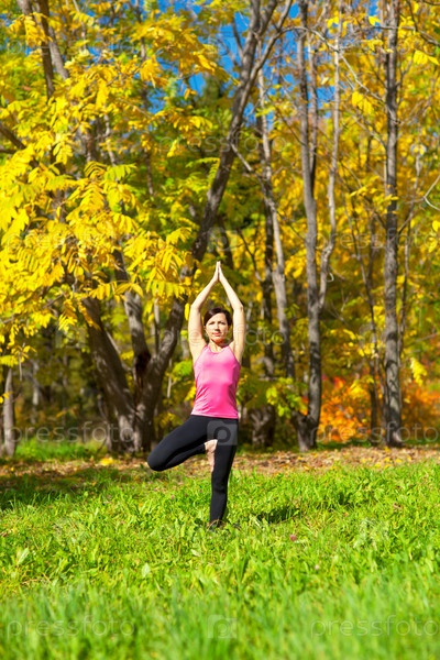 Молодая женщина занимается йогой в осеннем лесу, поза Врикшасана
