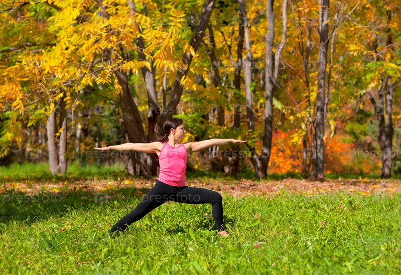 Молодая женщина занимается йогой в осеннем лесу, поза Вирабхадрасана