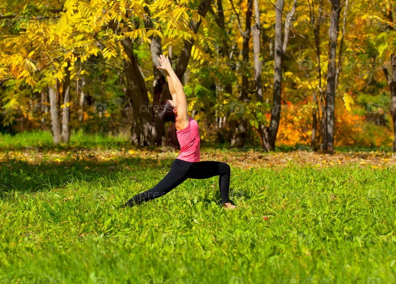Молодая женщина занимается йогой в осеннем лесу, поза Вирабхадрасана