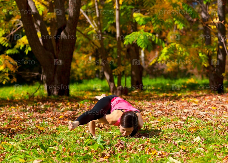 Молодая женщина занимается йогой в осеннем лесу, поза Каундиниасана