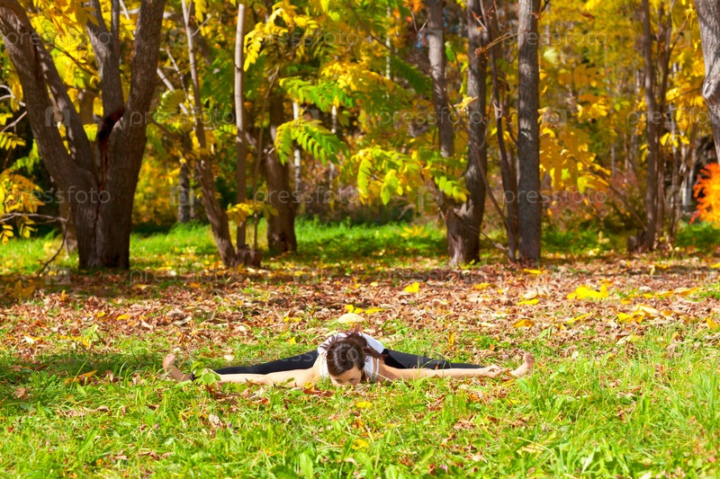 Молодая женщина занимается йогой в осеннем лесу, поза Упавишта Конасана