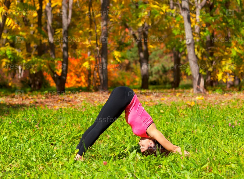 Молодая женщина занимается йогой в осеннем лесу, поза Адха Мукха Шванасана