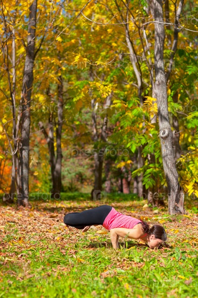 Молодая женщина занимается йогой в осеннем лесу, поза Падма-маюрасана