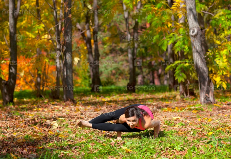 Молодая женщина занимается йогой в осеннем лесу, поза Аштавакрасана