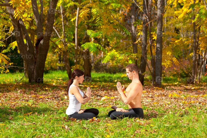 Мужчина и женщина занимаются йогой в лесу, поза Падмасана (поза Лотоса)