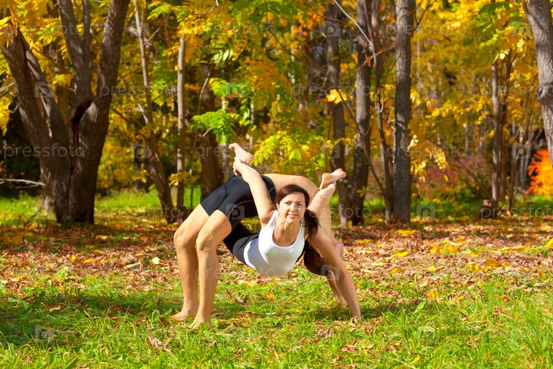 Мужчина и женщина занимаются йогой в лесу, позы Дханурасана и Урдхва дханурасана