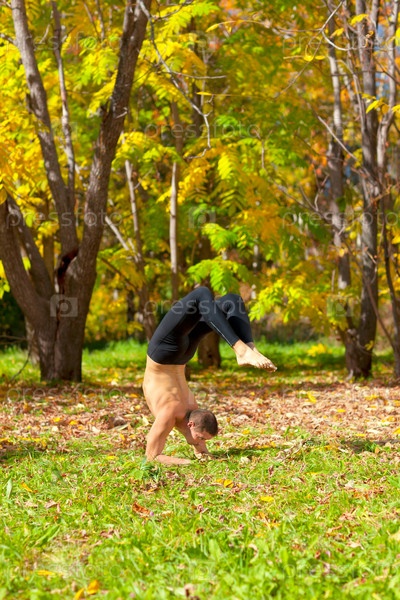 Мужчина занимается йогой в осеннем лесу, поза Врикшасана