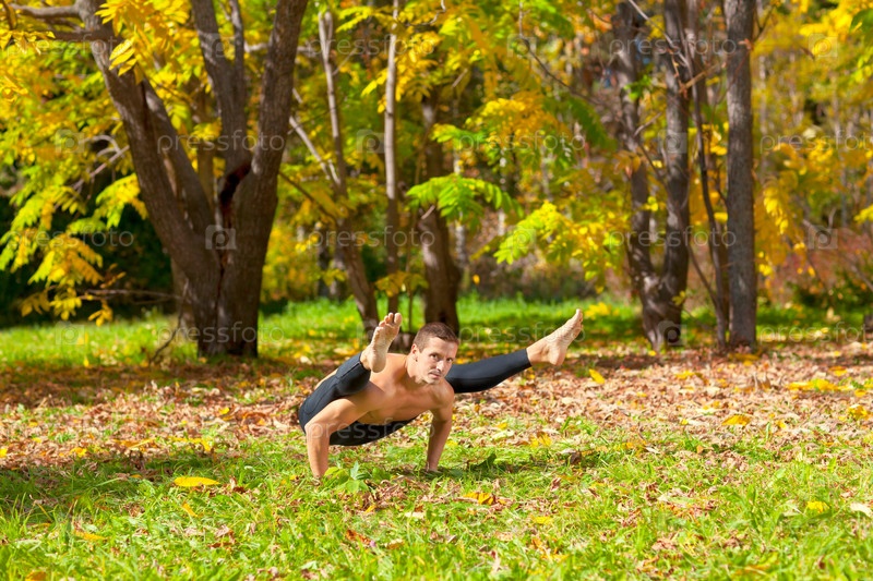 Мужчина занимается йогой в осеннем лесу, поза Титтибхасана