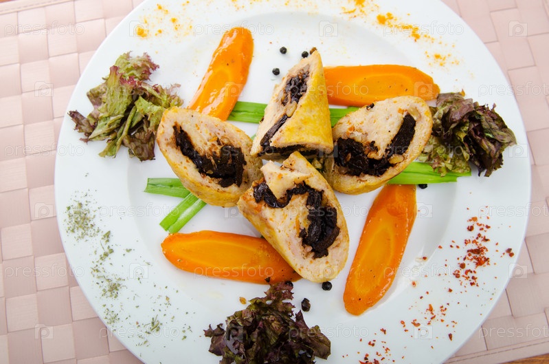 Мясо и овощной ролл на тарелке