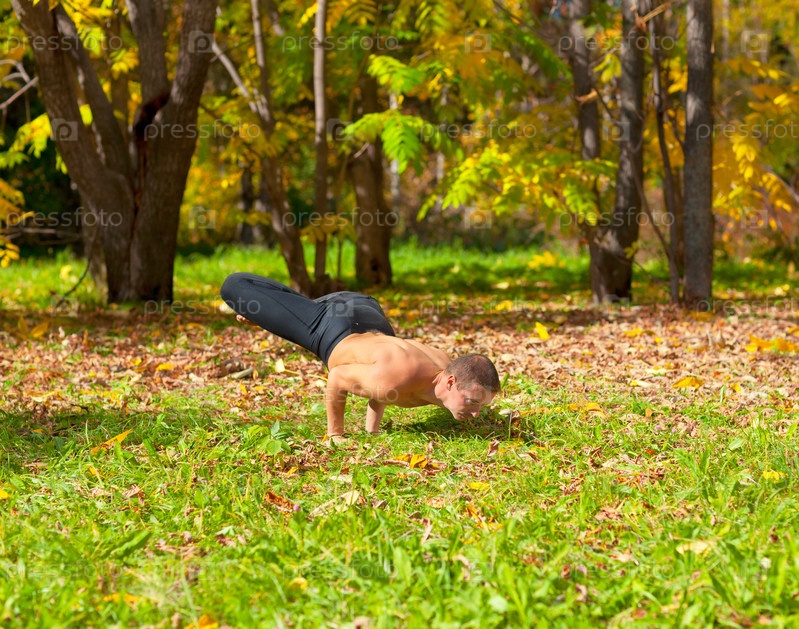 Мужчина занимается йогой в осеннем лесу, поза Падма-маюрасана