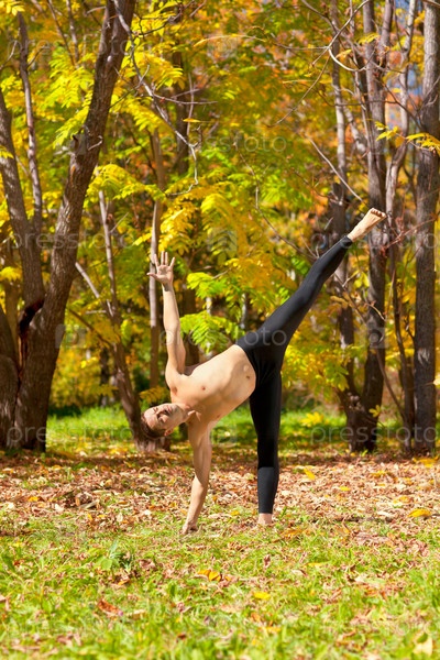 Мужчина занимается йогой в осеннем лесу, поза Ардха чандрасана